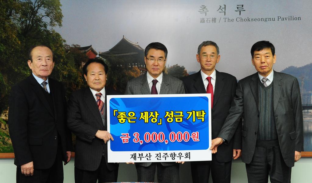 재부산 진주향우회(회장 박주태)는 10일 오후2시 30분 시를 방문하여 진주시 맞춤형 복지서비스인『좋은 세상』에 성금으로 사용해 달라며 3백만원을 전달하였다.