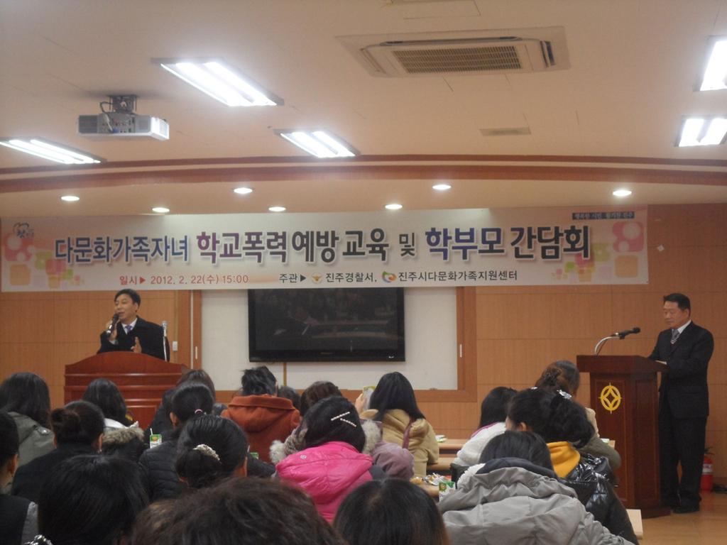 최근 다문화 자녀들의 학교내 부적응 문제 등이 사회적 이슈가 됨에 따라 이에 진주시다문화가족지원센터와 진주경찰서는 2월 22일 오후 3시 다문화가족 자녀 및 학부모 40여명을 대상으로 학교폭력예방 교육 및 학부모 간담회를 다문화가족지원센터 대강당에서 개최하였다.