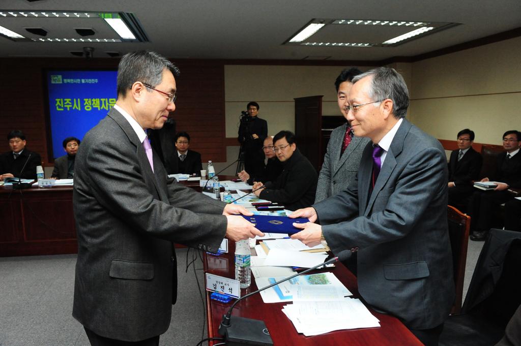 이날 이창희 진주시장은 인사말을 통해 지난 한 해 진주시는 한국토지주택공사 일괄유치를 이루어 내고 혁신도시 이전 11개 공공기관 중 4개 기관이 합동 착공하였으며, 첨단산업의 기본이 되는 뿌리산업기술혁신센터 개소와 대기업인 GS칼텍스, GS리테일을 비롯해 유수의 기업을 유치함으로써 진주가 서서히 기업도시로 부상하며 진주 발전의 큰 전기를 맞이하였다고 말하고 앞으로 진주시가 전통과 현대가 조화되는 첨단산업문화도시로 도약할 수 있도록 자문교수들의 창조적인 시책제안과 활발한 시정자문을 당부하였다.