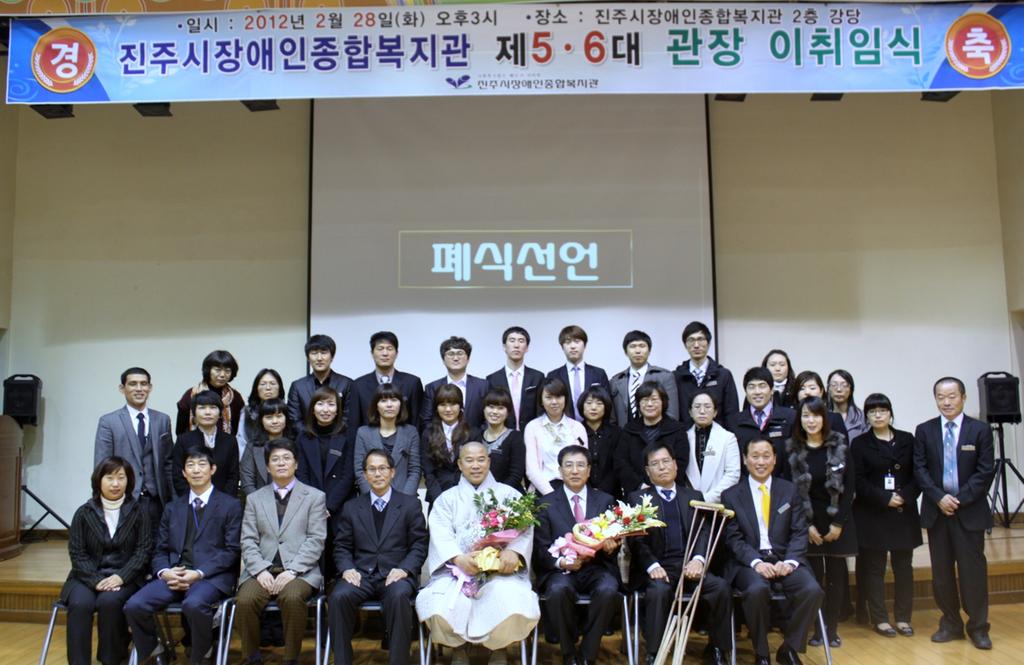 진주시장애인종합복지관에서는 28일 오후 3시 최구식ㆍ김재경 국회의원을 비롯한 김두행 시의회의장 및 도·시의원, 사회복지 관련기관 관계자, 자원봉사자, 장애인 등 200여명이 참석한 가운데 제5ㆍ6대 관장 이ㆍ취임식을 가졌다.