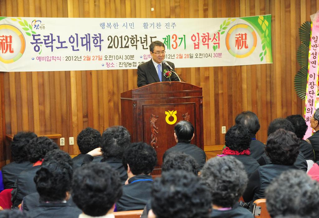 이날 입학식에서 이창희 진주시장은 축사를 통하여 “이곳 노인대학에서 육체적인 연령보다는 정신적인 젊음으로 잠재력과 자신의 역량을 개발하여 젊은이 못지않은 노익장을 과시해 주시기를 당부하고, 우리시에서도 어르신들이 보다 편안하고 즐거운 노후를 보내실 수 있도록 최선을 다해 나가겠다”고 밝혔다.