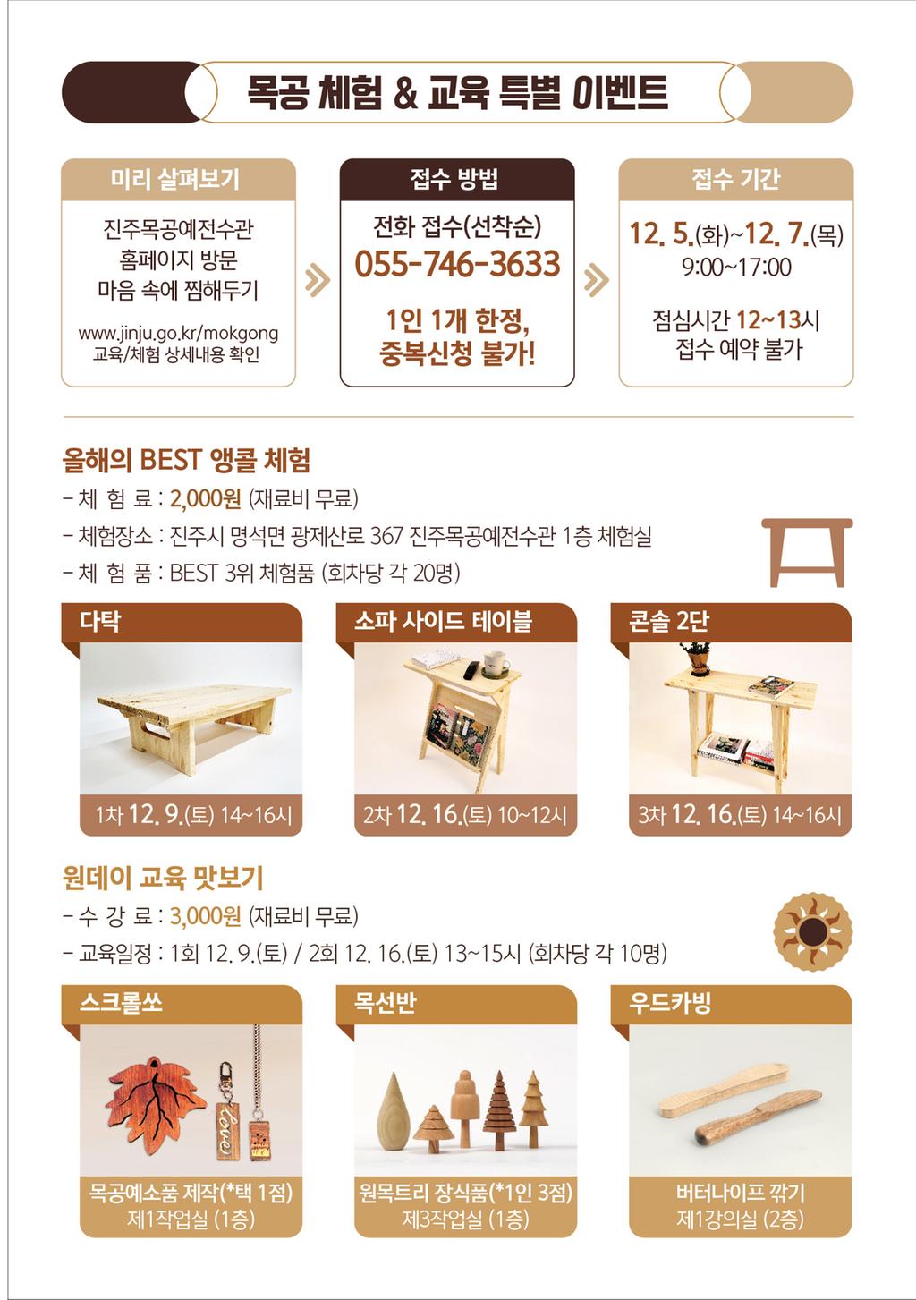 수강생들의 작품 120여점 전시와 더불어 목공 체험 행사를 개최합니다.