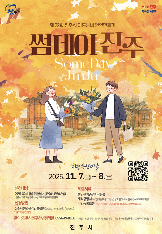 제22회 진주시 미혼남녀 인연만들기 행사 「썸데이 진주」참가자를 모집하오니 많은 관심 부탁드립니다.