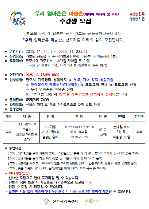 ❍ 신청기간 : 2025년 10월 17일 금요일 10:00 ~ 마감 시까지 ❍ 대 상 : 진주시에 주민등록이 되어 있는 1~5개월(25년 6월부터 출생한 영아) 자녀를 둔 가정 ❍ 운영기간 : 2025년 11월 7일 ~ 11월 28일 매주 금요일 13:30~14:20 ❍ 준비물 : 큰타월(속싸개) 및 식물성 오일 ❍ 장 소 : 가호동 공동육아나눔터(가호로44번길 4 남부어린이도서관 1층) ❍ 신청방법 : 진주시 가족센터 홈페이지 온라인 접수(선착순 모집) ❍문의전화 :055-749-7409 ※ 자세한 사항은 홍보문을 참고 바랍니다.