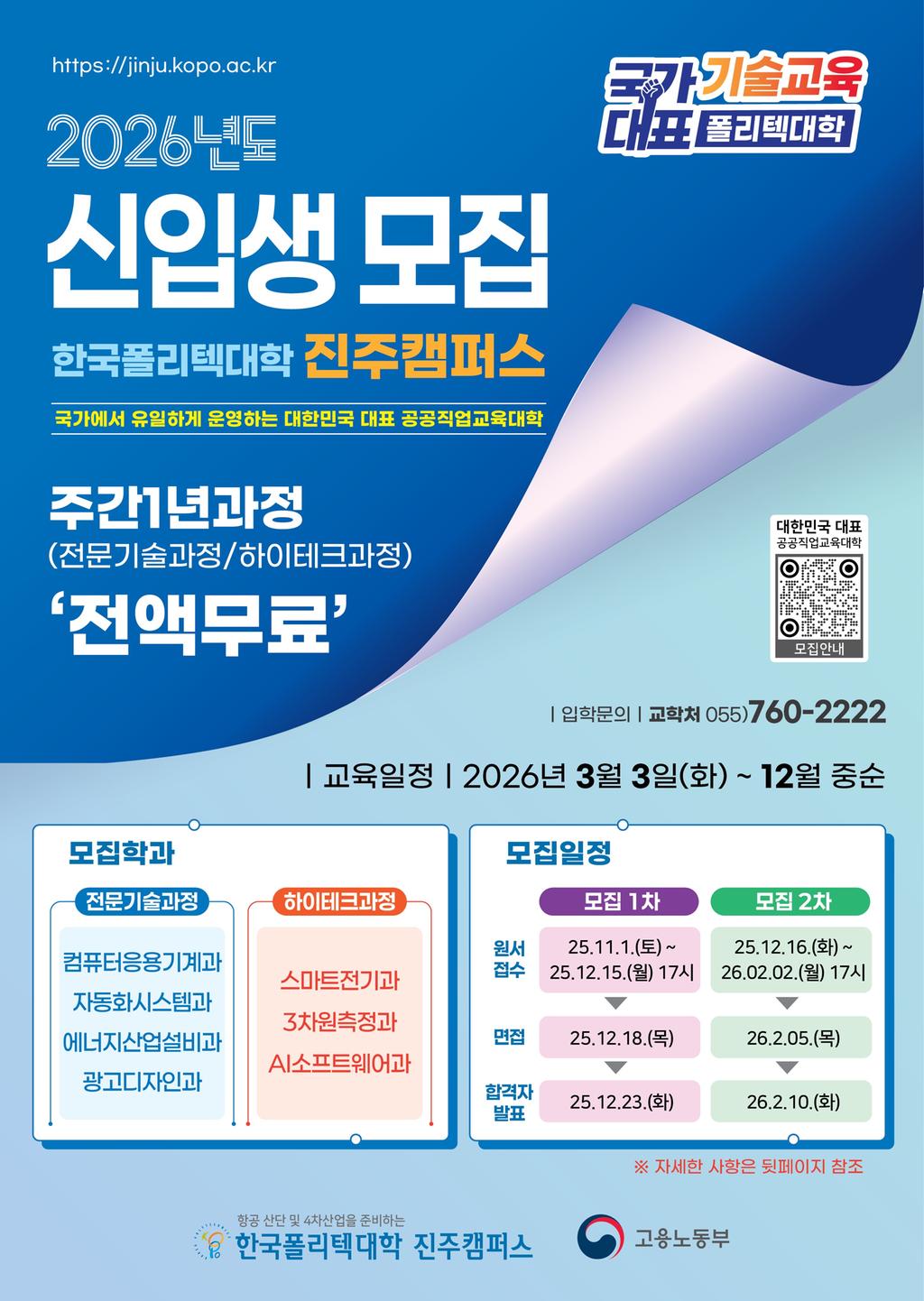 2026년도 한국폴리텍대학 진주캠퍼스 국비 취업교육생 모집 안내