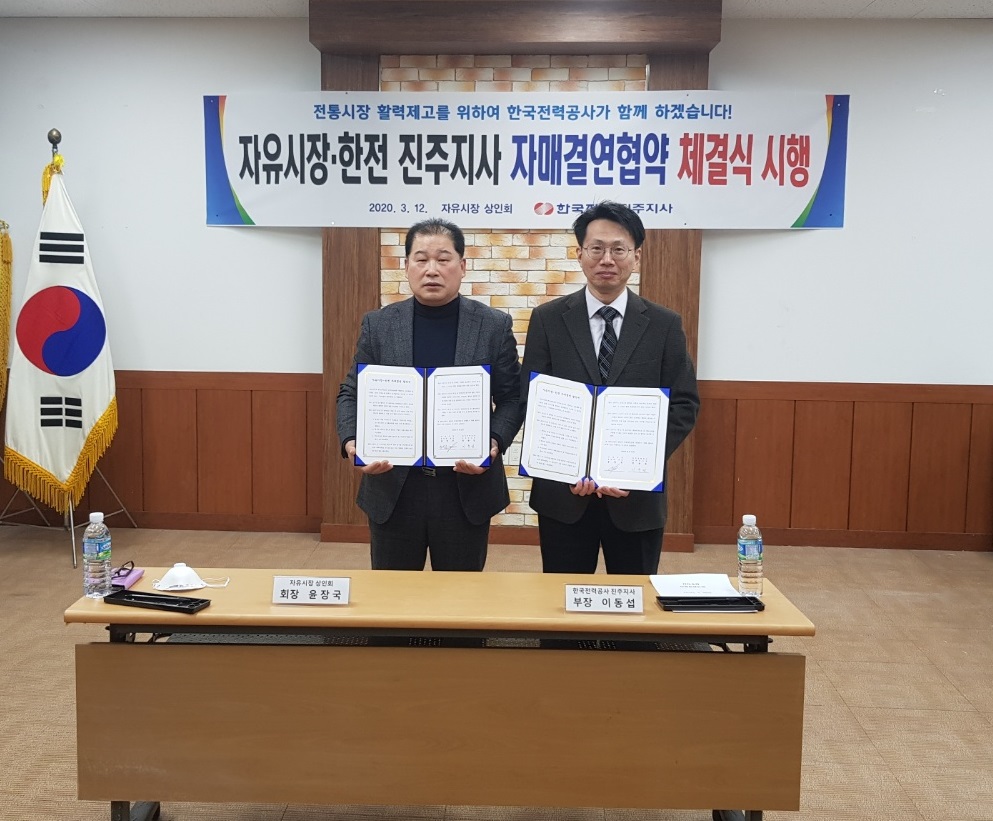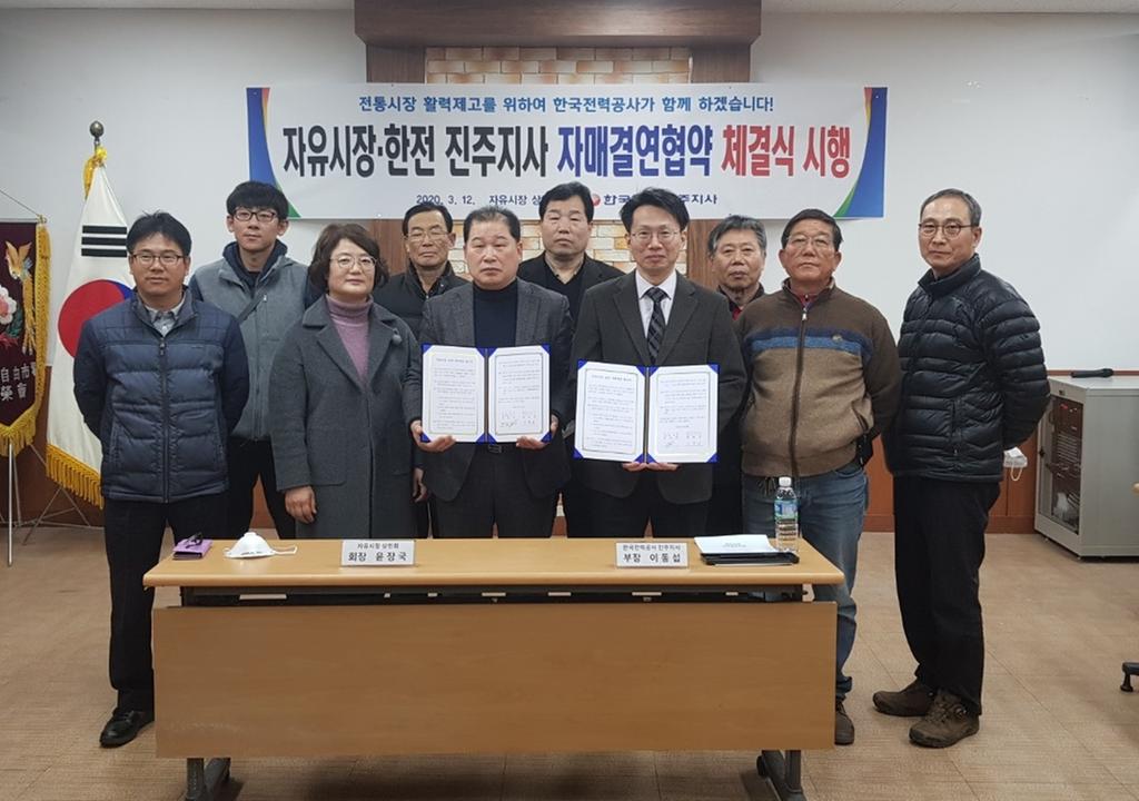 진주시 자유시장 상인회와 한국전력 진주지사는 12일 자유시장 상인회 회의실에서 전통시장 자매결연 협약을 체결하고 전통시장 살리기에 나섰다.