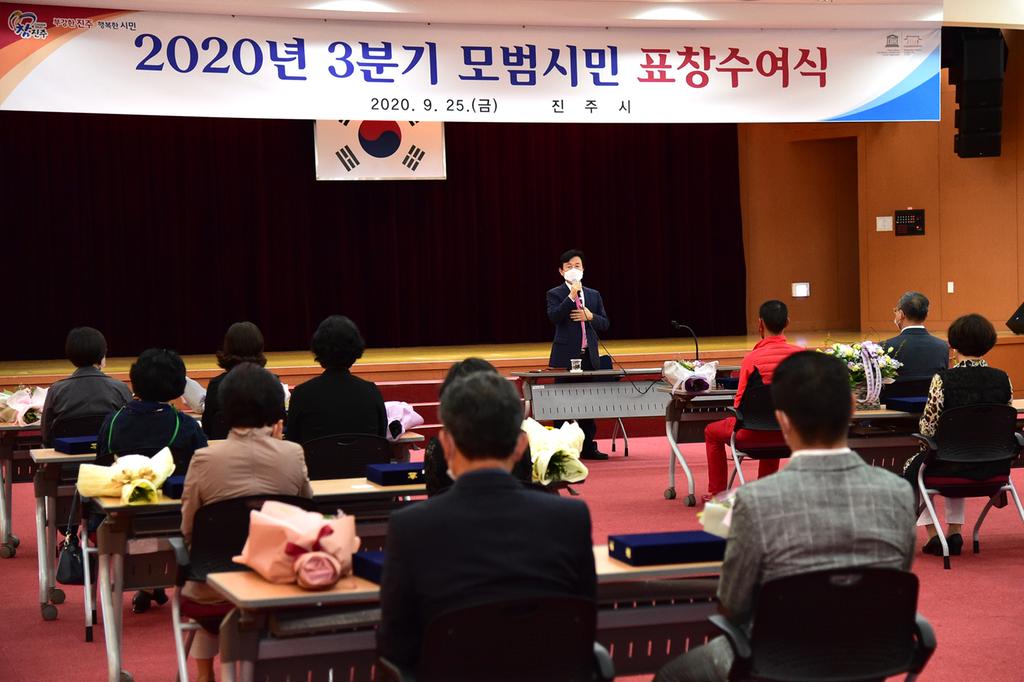 진주시는 25일 오전 시청 시민홀에서 시정 발전을 위해 기여한 각계 각층의 유공자가 참석한 가운데 2020년 3분기 모범 시민 표창식을 가졌다.