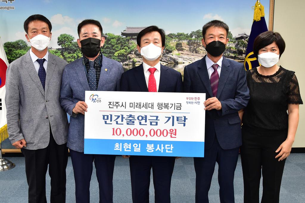 또한, 지역사회를 위해 다양한 봉사활동을 하고 있는 최현일 봉사단도 진주시의 지역인재 양성 취지에 공감하여 기탁에 동참하고자 한다며 1000만 원의 기탁증서를 전달했다. 최현일 봉사단은 소년소녀가장, 독거노인, 저소득층 가정의 주거환경 개선을 목적으로 지난 2011년 3월에 설립돼 180여명의 회원 회비로 운영되며, 지금까지 45가구에 집수리 봉사활동을 펼쳤다.