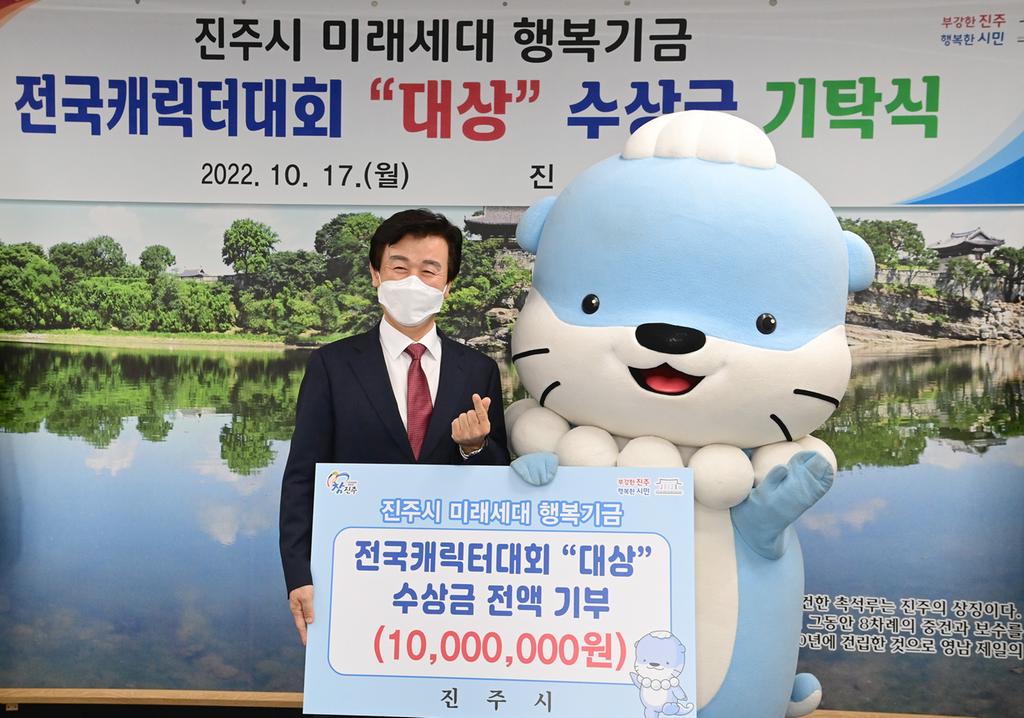 진주시는 17일 문화체육관광부 주최 ‘제5회 우리동네캐릭터 대상’에서 대상을 포함해 3개 부문을 석권한 진주시 관광캐릭터 ‘하모’가 받은 1000만 원의 수상금 전액을 미래세대 행복기금에 지정 기탁했다고 밝혔다.