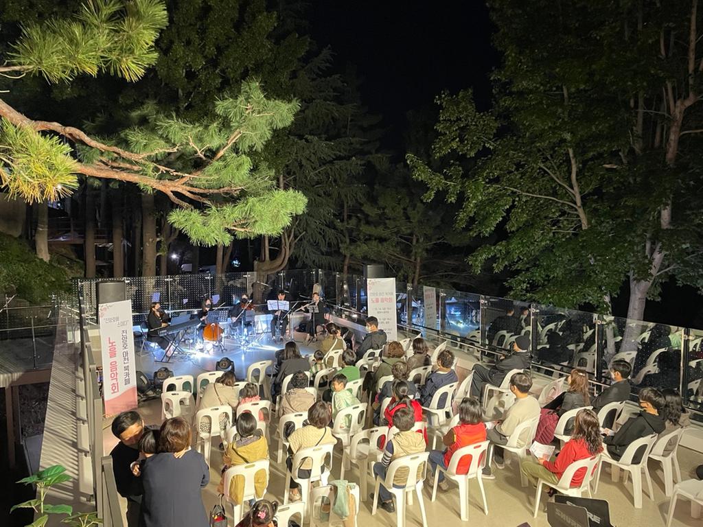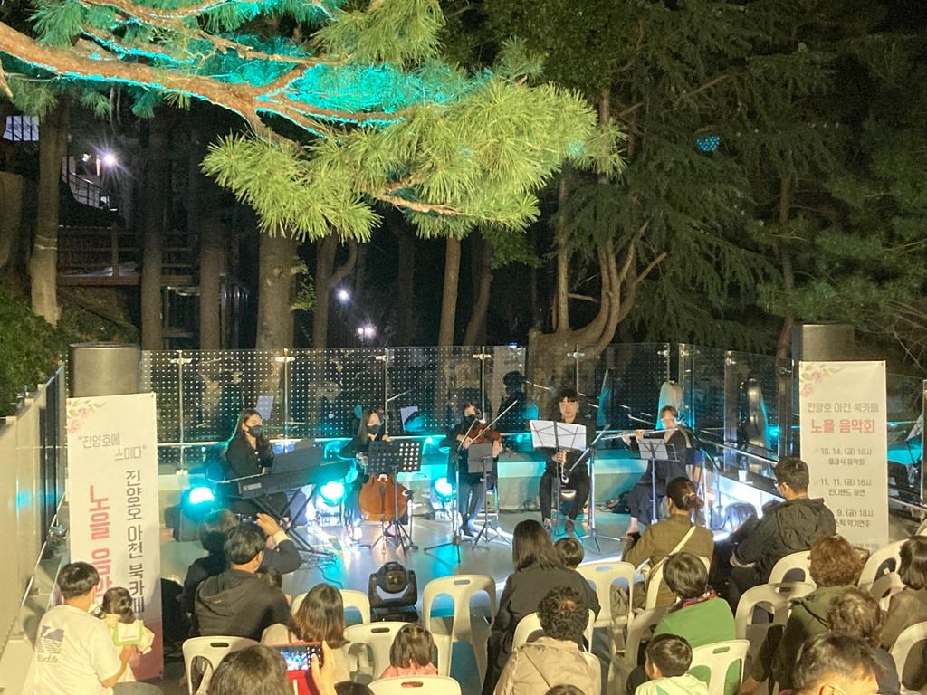 진양호 전망을 한 눈에 볼 수 있는 아천북카페 루프탑에서 열린 ‘노을음악회’는 감성을 자극하는 힐링 음악회로, 이날 오후 6시부터 시작된 음악회는 첼로, 비올라 등 현악기로 연주되는‘사랑의 인사’를 시작으로 클래식과 동요 및 가요, ‘10월의 어느 멋진 날에’, ‘라라랜드 OST’ 등 감미로운 음악 연주로 진행됐다.