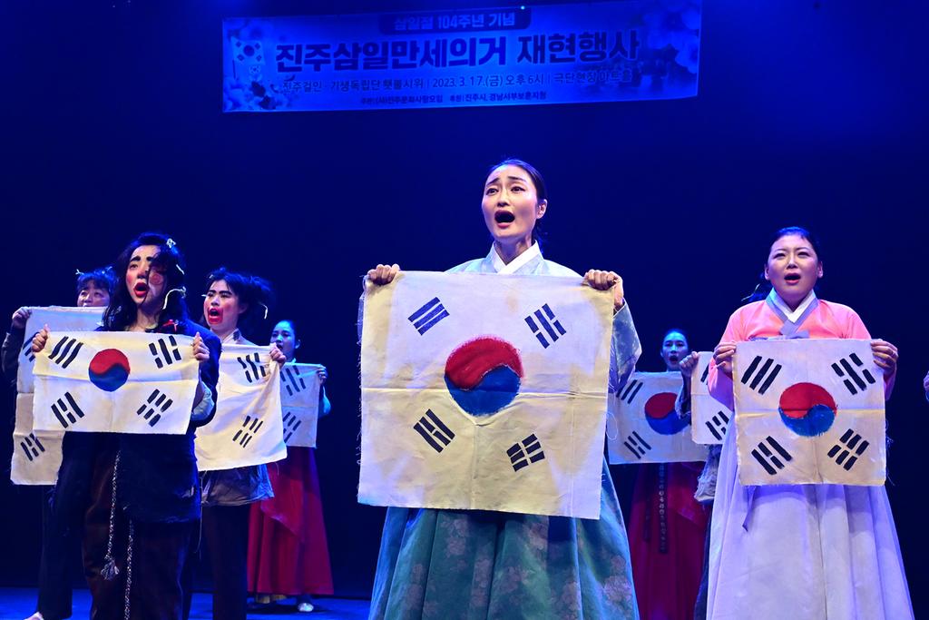 이날 재현 행사는 진주시민과 중․고등학생 100여 명이 104년 전 경남도청 앞 삼일만세의거를 상기하며 윤도현의 노래 ‘아리랑’에 맞추어 손수 만든 태극기를 힘차게 흔들며 시작됐다.