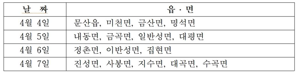 찾아가는 동물등록 서비스는 읍․면 지역을 대상으로 시행되며, 읍․면별 일정은 아래 표와 같다. 마을별 장소와 방문시간은 읍․면사무소로 문의하면 알 수 있다.