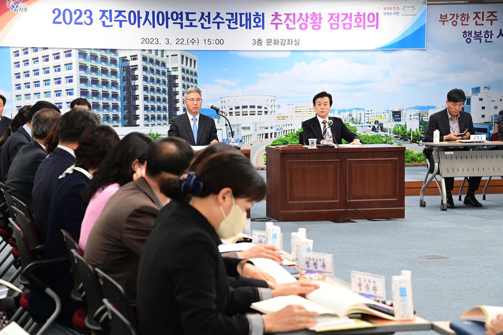 지난 3월 22일에는 조규일 진주시장(대회조직위원장) 주재로 추진상황 점검회의를 개최하여 예비엔트리 접수 결과를 바탕으로 수송, 숙박, 음식, 의료, 환경, 의전 등 전 분야에 걸쳐 진주를 방문하는 선수와 관계자들이 최상의 환경에서 최고의 기량을 낼 수 있도록 대회 준비에 박차를 가했다.