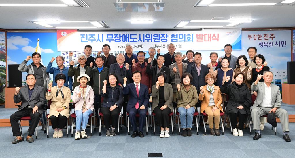 진주시는 24일 시청 문화강좌실에서 읍면동 무장애도시위원장 30명이 참여한 가운데 ‘진주시 무장애도시위원장 협의회’ 발대식 행사를 개최했다.
