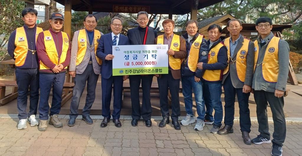 진주강남라이온스클럽(회장 김용태)은 6일 진주시복지재단(이사장 이성갑)에 사회복지시설 운영 지원에 사용해 달라며 성금 500만 원을 기탁했다.