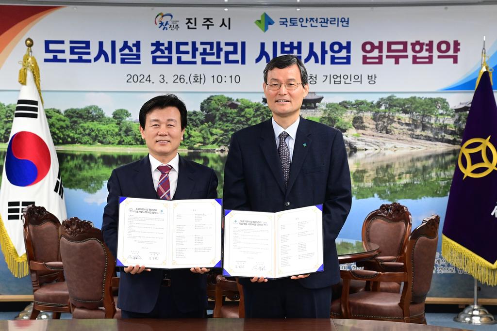 진주시는 국토안전관리원(원장 김일환)과 국토안전관리원이 주관하여 시행하고 있는 ‘도로기반시설 첨단관리기술 개발의 실증 시범사업’을 위해 26일 시청 기업인의 방에서 업무협약을 체결했다.