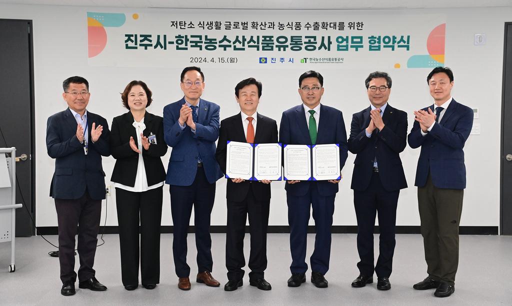 진주시는 지난 15일 먹거리통합지원센터에서 한국농수산식품유통공사(aT)와 저탄소 식생활 확산과 농식품 수출 확대를 위한 업무협약을 체결했다.