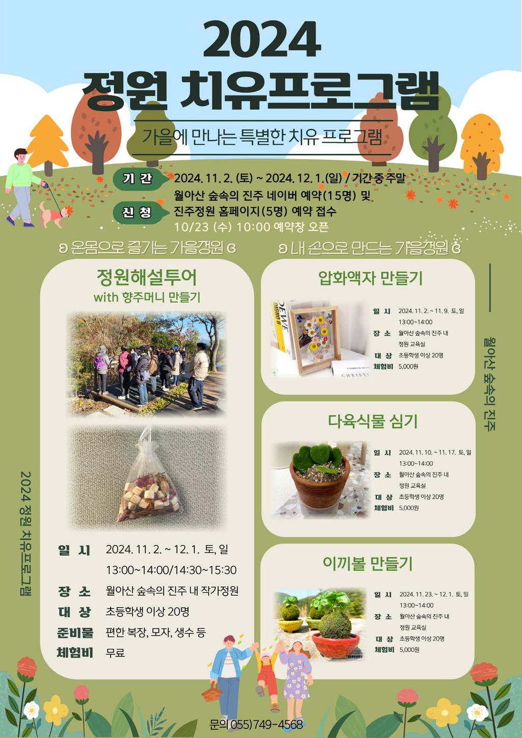 진주시는 시민들의 건강증진을 위해 가을에 만나는 특별한 치유프로그램이라는 주제로‘2024 정원 치유프로그램’을 운영하고 있다.