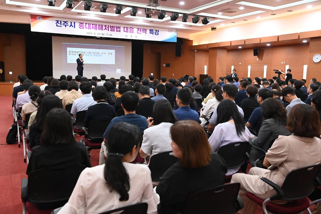 진주시는 22일 시청 시민홀에서 현업근로자와 공사·용역 담당 공무원 등 180여 명을 대상으로 ‘중대재해처벌법 대응 전략 특강’을 개최했다.