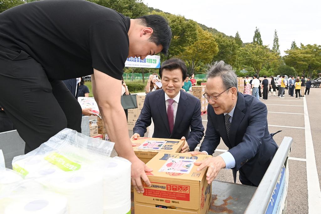 조규일 진주시장은 22일 충무공동 진주종합경기장에서 진주시복지재단과 지역사회보장협의체와 함께 따뜻한 추석 명절을 보낼 수 있도록 쌀과 라면, 화장지. 상품권 등을 전달하는 한편 복지관과 아동복지시설 2곳을 방문해 거주하고 있는 생활인과 관계자들을 위로하고 격려했다.