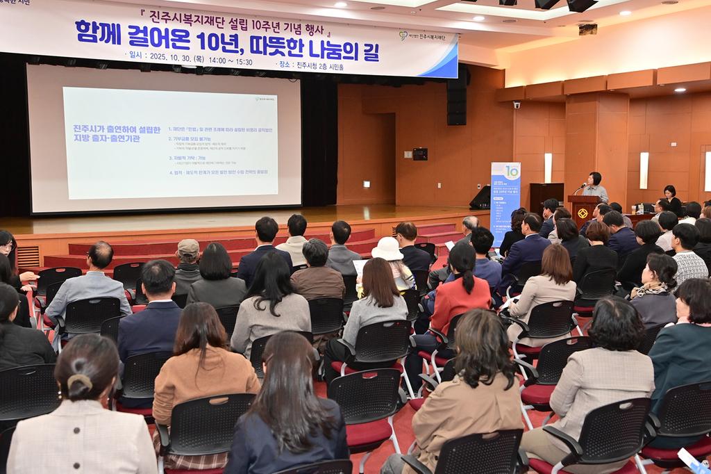 진주시복지재단(이사장 이성갑)은 30일 시청 2층 시민홀에서 주요 복지시설 관계자, 시민, 기부자 등 약 200여 명이 참석한 가운데『진주시복지재단 설립 10주년 기념식』을 성황리에 개최했다고 밝혔다.
