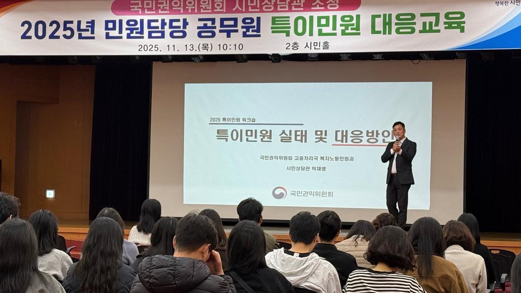 이날 강의는 박재병 시민상담관이 맡아 국민권익위원회 조사 자료와 실제 사례를 토대로 특이민원의 발생요인과 대응방안을 공유하고, 현장에서 바로 적용할 수 있는 실질적인 노하우를 전수해 큰 공감을 얻었다.