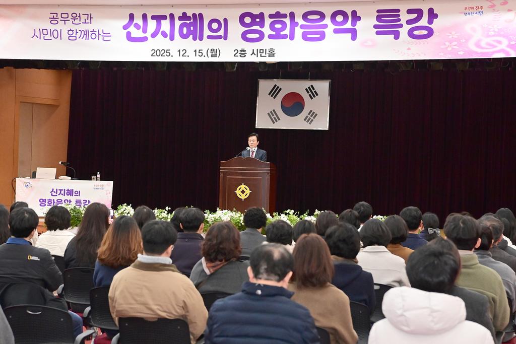 이날 특강은 오전과 오후, 2회에 걸쳐 진행됐으며, 200여 명의 시민과 공무원이 참석해 높은 관심을 보였다. 강의는 「영화음악의 이해와 감상」을 주제로 ▲영화음악의 기초 용어 설명 ▲장면을 완성하는 음악의 기능 ▲감동을 더했던 명장면 사례 등을 중심으로 구성돼 큰 호응을 얻었다.