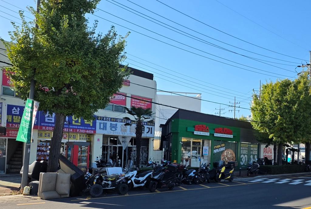 공단로터리 모퉁이에 위치한 오토바이 정비업체 전면 보도블록에