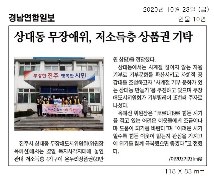 2020.10.23.(금), 경남도민신문, 무장애도시 상대동위원회 저소득층 상품권 기탁