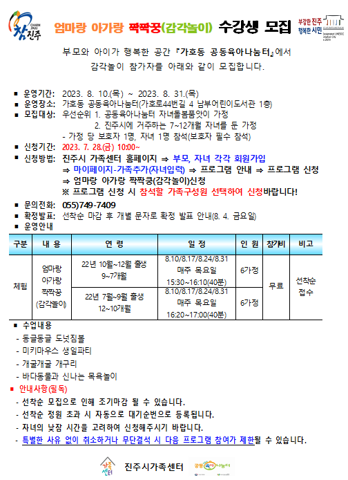 매주 목요일 9~7개월-15:30~16:10 / 12~10개월-16:20~17:00 ❍ 장 소 : 가호동 공동육아나눔터(가호로44번길 4 남부어린이도서관 1층) ❍ 대 상 : 12가정(24명) - 연 령 : 22년7월~22년12월 출생 아기 - 자녀돌봄품앗이 가정/진주시에 주민등록 둔 7~12개월 자녀를 둔 가정 ❍ 주요내용 - 동글동글 도넛짐볼 - 미키마우스 생일파티 - 개굴개굴 개구리 - 바다동물과 신나는 목욕놀이 ❍ 문의전화 : 055-749-7409