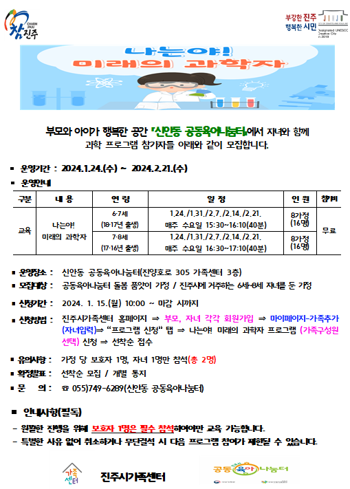 신안동 공동육아나눔터 – 나는야! 미래의 과학자 ❍ 기 간 : 2024년 1월 24일(수) ~ 2024년 2월 21일(매주 수요일) - 6·7세(18·17년생)반: 15:30 ~ 16:10(40분) - 7·8세(17·16년생)반: 16:30 ~ 17:10(40분) ❍ 장 소 : 신안동 공동육아나눔터(진양호로 305 진주시가족센터 3층) ❍ 대 상 : 공동육아나눔터 돌봄 품앗이 가정 진주시에 주민등록 둔 6세 ~ 8세 자녀를 둔 가정 ※ 가정 당 보호자 1명, 자녀 1명까지 참석(보호자 필수참석) ❍ 신청방법 : 진주시가족센터 홈페이지 온라인 접수(선착순 모집) ❍ 주요내용: 자녀와 함께하는 과학 프로그램 ❍ 문의전화 : 055-749-6289 ※ 자세한 사항은 첨부파일을 참고하시 바랍니다.