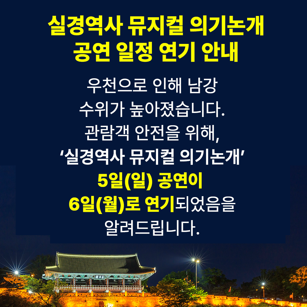 ※ 실경역사뮤지컬 의기논개 5.5.(일) 공연은 남강 수위가 높아져 안전을 위해 익일(5.6.(월)) 동일 시간대로 연기되었습니다.(안내문자 및 연락) 6일 공연을 보실 수 없는 분은 전액 환불해드리며 예매취소를 원하시면 번거로우시더라도 055-746-7411, 7413으로 연락주시면 친절히 도와드리겠습니다. 야외공연이라 날씨의 영향을 많이 받는 점 부디 양해부탁드립니다.