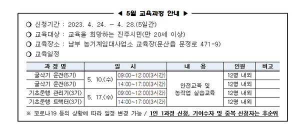 5월 농기계 자체교육과정을 다음과 같이 안내하오니, 관심이 있는 농가께서는 2023. 5. 1.(월)까지