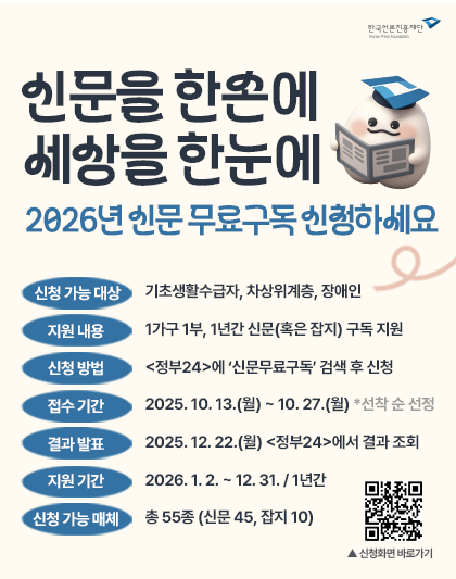 ○ 신문 무료 구독 지원사업 안내 - 지원내용 : 신문 무료 구독 - 신청대상 : 기초생활수급자, 차상위계층, 장애인 - 신청기간 : 2025. 10. 13.(월) ~ 10. 27.(월) - 신청방법 : 정부24(plus.gov.kr)에서 ‘신문 무료 구독’ 검색 후 신청 - 지원기간 : 2026년 1월 ~ 12월 (1년간) - 협조요청 : 붙임 자료를 활용하여 대상 주민에게 사업 안내 및 홍보