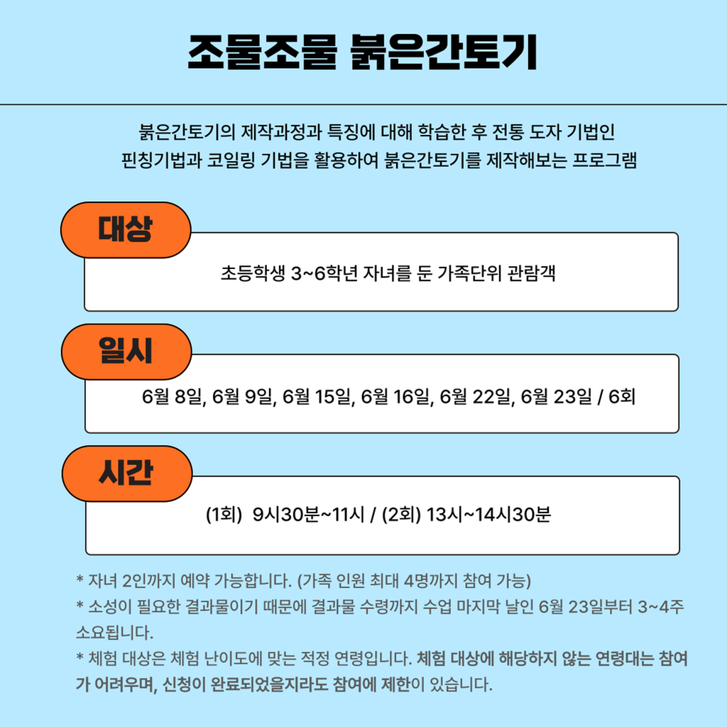 ※ 안내사항 1. 보호자를 포함하여 예약 부탁드립니다. 2. 자녀 2인까지 예약 가능합니다. (가족 인원 최대 4명까지 참여 가능) 3. 참여가 가능한 자녀는 초등학생 3~6학년입니다. 4. 소성이 필요한 결과물이기 때문에 결과물 수령까지 수업 마지막 날인 6월 23일부터 3~4주 소요됩니다. 5. 개인사정으로 불참하게 될 경우 프로그램 시작 2일 전까지 연락 바랍니다. 6. 체험 대상은 체험 난이도에 맞는 적정 연령입니다. 체험 대상에 해당하지 않는 연령대는 참여가 어려우며, 신청이 완료되었을지라도 참여에 제한이 있습니다. 7. 자세한 교육 내용은 진주청동기문화박물관의 홈페이지를 참고하시기 바랍니다.