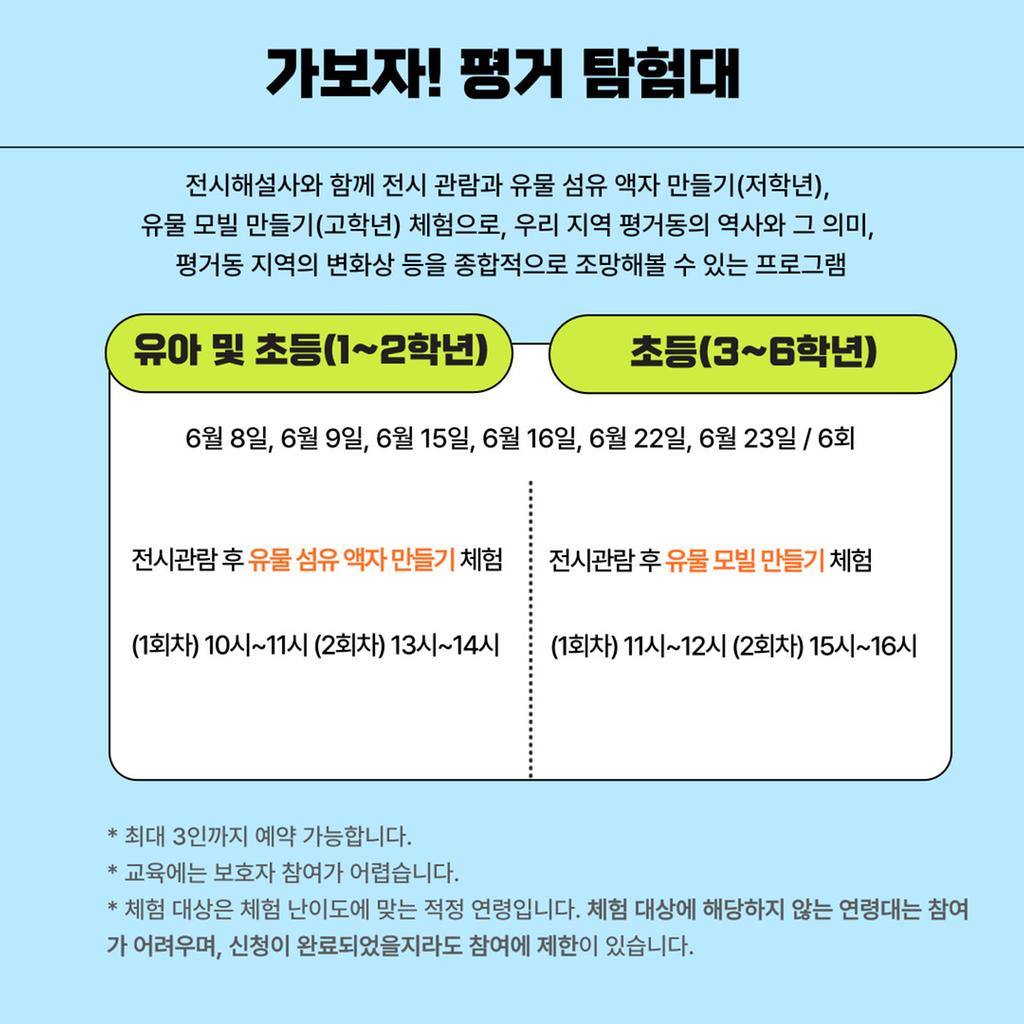 □ 가보자! 평거 탐험대(유아 및 초등1, 2학년) ‘가보자! 평거 탐험대’는 청동기문화박물관의 기획전시와 연계한 프로그램으로, 전시해설사와 함께 전시 관람과 유물 섬유 액자 만들기 체험으로 구성되어 있습니다. 이번 교육을 통해 평거동의 역사와 그 의미, 평거동 지역의 변화상 등을 종합적으로 조망하여 우리 지역에 대한 관심과 이해를 높일 수 있는 시간을 가지시길 바랍니다. - 일 정 : 2024년 6월 8일 ~ 6월 23일 / 매주 토·일요일 - 시 간 : (1회차) 10시~11시 / (2회차) 13시 ~ 14시 (1시간 내외)