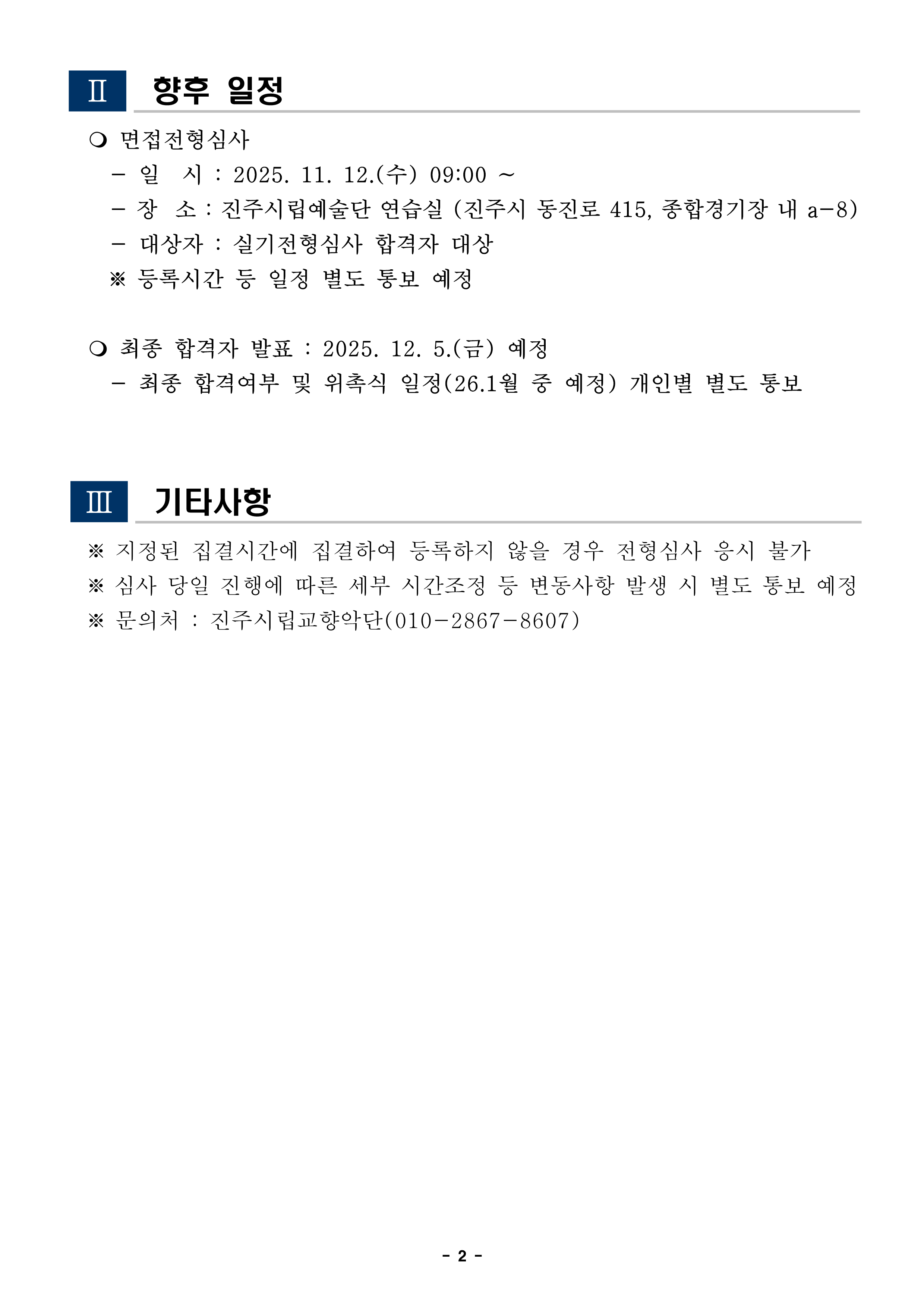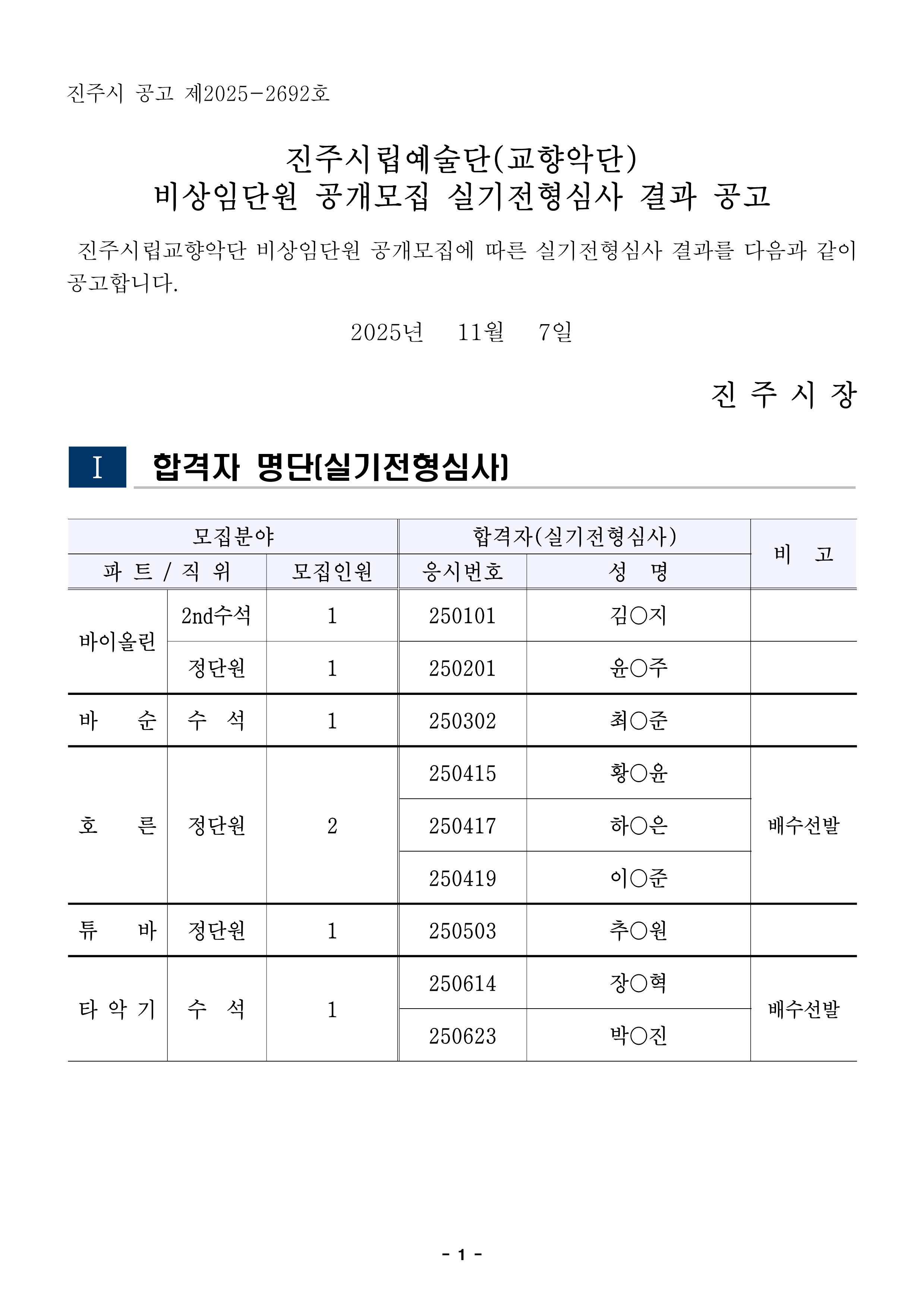 진주시립교향악단 비상임단원 공개모집 실기전형심사 결과 공고