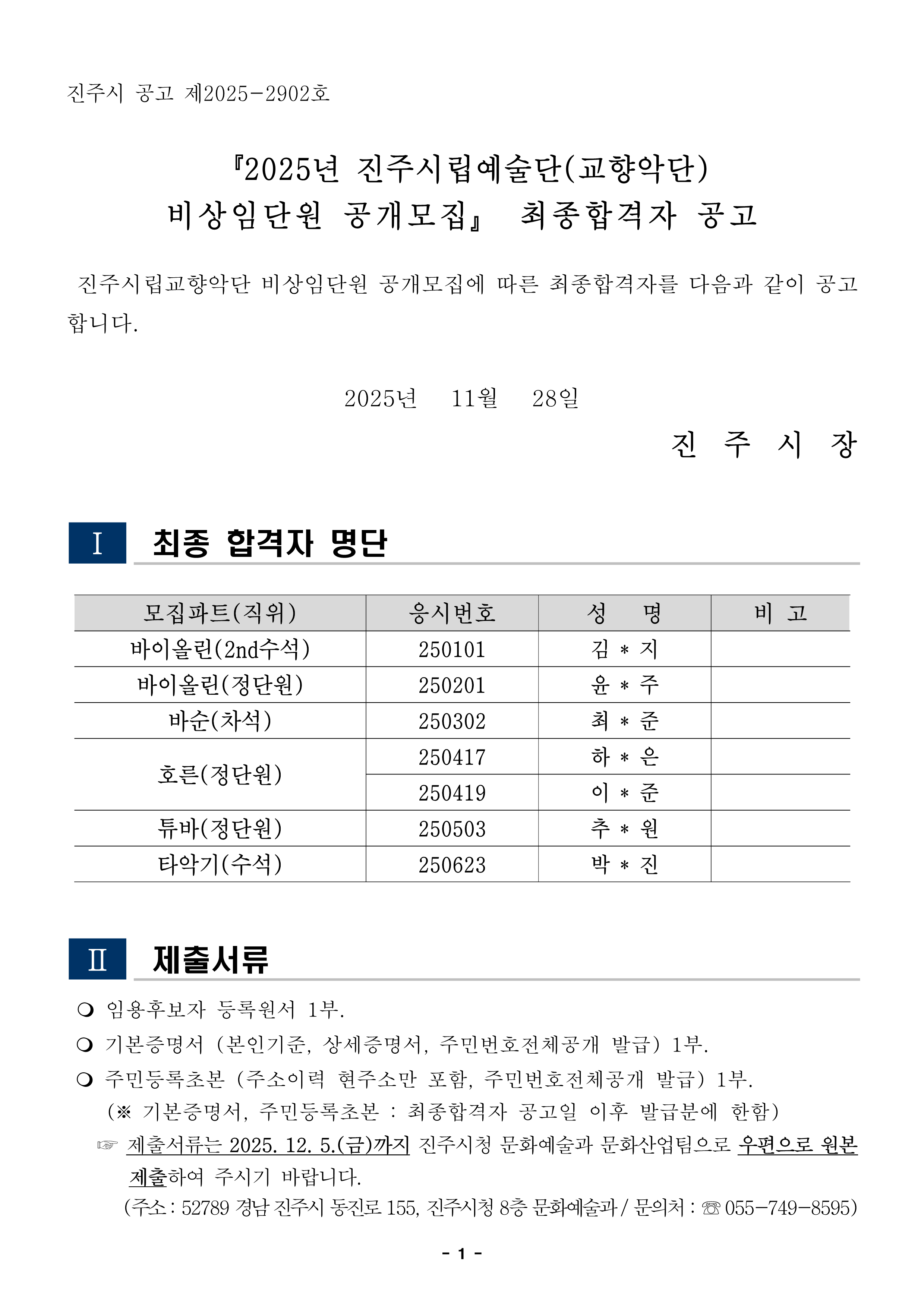 진주시립예술단(교향악단) 비상임단원 공개모집 최종합격자 공고 작성자이윤하 작성일2025-11-28 조회수285 ★공고문(2025년 진주시립예술단(교향악단) 비상임단원 공개모집 최종합격자 공고).hwp 첨부 파일 내 제출 서류 확인해 주십시오.