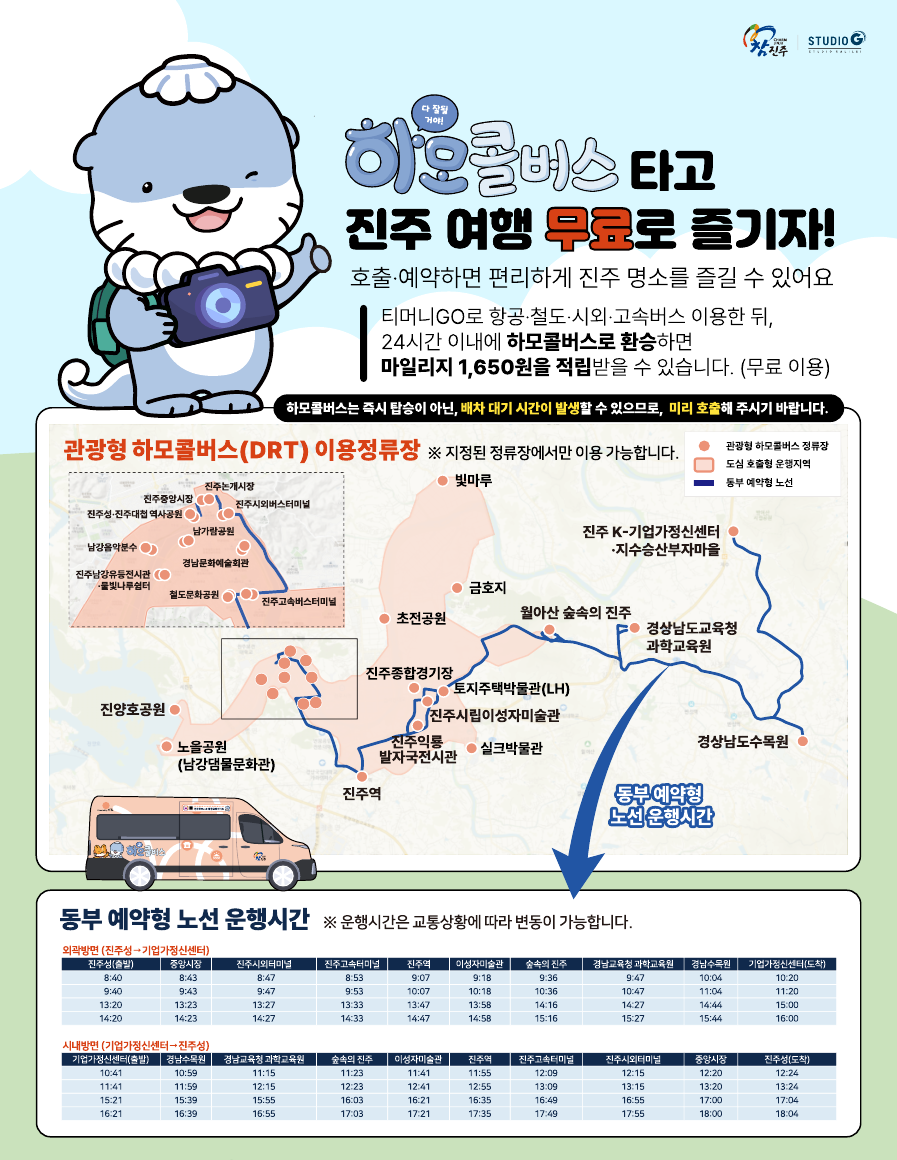 정 류 장 지정된 정류장만 승∙하차 가능 | 21개 진주성,중앙시장,시외터미널,고속터미널, 진주역,이성자미술관,숲속의진주, 진양호공원,음악분수대,유등전시관/물빛나루쉼터, 남가람공원,문화예술회관,철도문화공원, 익룡발자국전시관,빛마루,금호지,실크박물관, 진주종합경기장,토지주택박물관(LH),초전공원, 노을공원(남강댐물문화관) ※ 파란색은 호출형,예약형 모두 가능 | 10개 진주성(출발,도착)↔중앙시장↔시외터미널↔고속터미널↔ 진주역↔이성자미술관↔숲속의진주↔ 과학교육원↔수목원↔기업가정신센터(도착,출발)