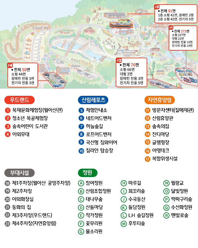 · 소형(25인승), 중형버스(35인승)는 목재문화체험장옆에서 방문객 내려주고 제1 또는 제2주차장에 주차
