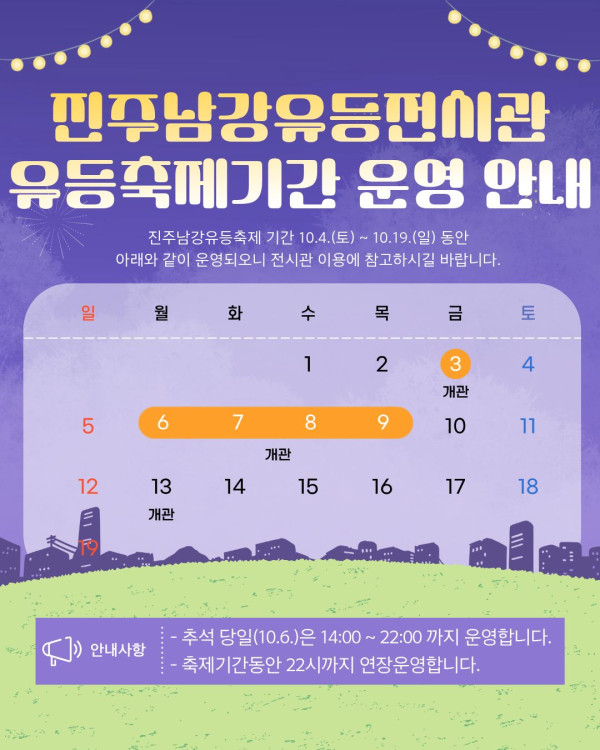 진주남강유등전시관 유등축제 기간 운영 안내 작성일 2025.09.23 조회 75회 본문 진주남강유등전시관은 유등축제 기간 동안 위와 같이 운영되오니 전시관 방문 시 참고 바랍니다. Prev Next 목록으로 Prev Next 목록으로