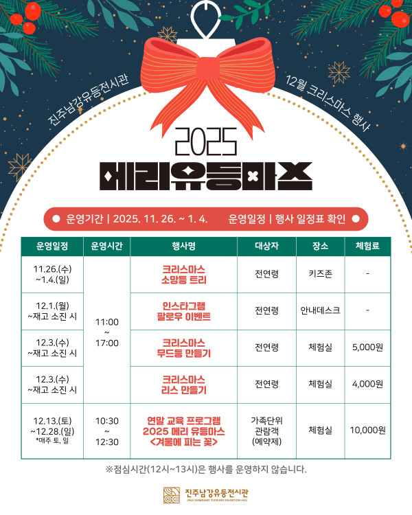 2026 크리스마스 행사 <메리유등마스> 작성일 2025.11.30 조회 44회 본문 *체험 프로그램은 전시관 내부 사정에 따라 운영 시간이 변경될 수 있으니 이 점 양해 부탁드립니다. Next 목록으로 Next 목록으로